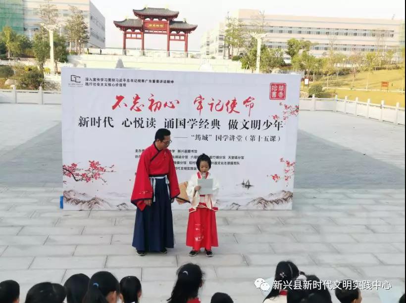 为深入开展国学经典学习活动,营造人人学国学的浓厚氛围,12月14日,新兴县图书馆新时代文明实践站与新兴县实验中学联合举办了“不忘初心,牢记使命”新时代,心悦读,诵国学经典,做文明少年——“筠城”国学讲堂第十五课。