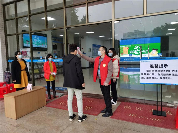 三、全面把好入口防疫,测体温、多消毒、登记报告。服务中心正式对外后,在办事大楼一楼大厅门前设置防疫监测岗,对所有进入大厅的工作人员和办事群众认真进行体温测量登记和健康观察,要求其正确佩戴口罩主可进入,并安排人员引导群众按照中心既定路线有序停放车辆。对进入人员进行体温监测时,一旦发现发热、干咳、呼吸困难等症状的人员,立即实名登记,并及时通知相关部门。同时各窗口工作人员对办事群众的姓名、身份证号码、户籍所在地、电话号码及办事时间进行详细登记。