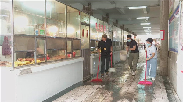 为做好当前的疫情防控工作,我县中心市场等各大农贸市场每日坚持对市场经营场所及周边进行清洁消毒,并挨家挨户对各经营档主进行疫情防控知识宣传和测温。