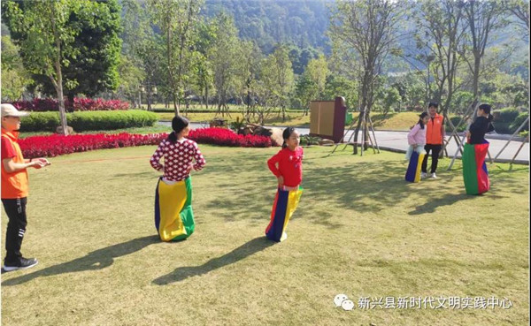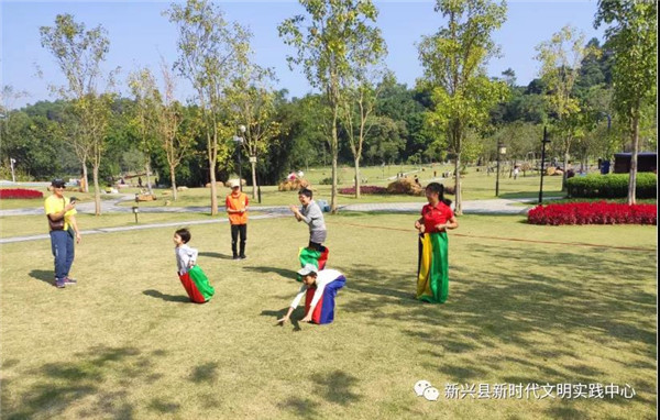 活动还开展了亲子游戏——“袋鼠接力跳”,游戏中,家长和孩子在志愿者的帮助下把袋子套在腿上,然后提着袋子开始接力跳,每个人都像一只活灵活现的袋鼠欢快地草坪上蹦跳。