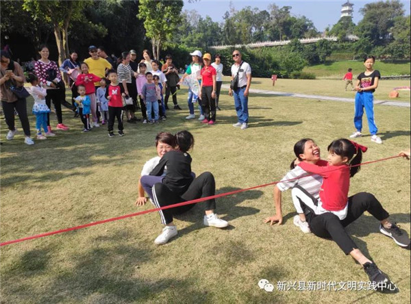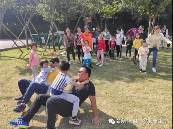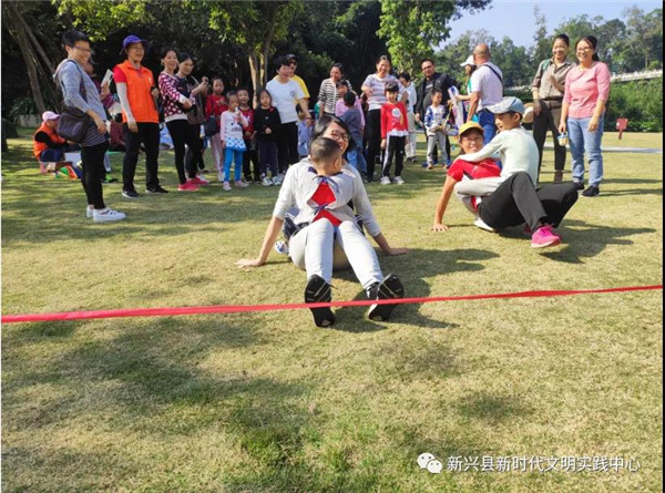 另一个“大力士爸爸/妈妈”游戏,孩子们则像猴子一样抱着家长一起滑向终点。孩子和家长通过默契的合作获得了众人的掌声,游戏场上充满欢声笑语,纷纷吸引周围群众前来观看。