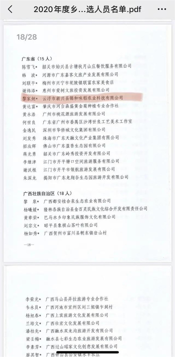 来自云浮新兴县锦和味稻农业科技有限公司黎家炯入选,他回乡打造的云座农场原生态田园综合体项目,不仅盘活农村土地,增加村民收入,还在2019年“创青春”广东青年文化和旅游创新创业大赛决赛中荣获乡村文旅组二等奖,跻身网红民宿,被列入省乡村旅游精品线路。