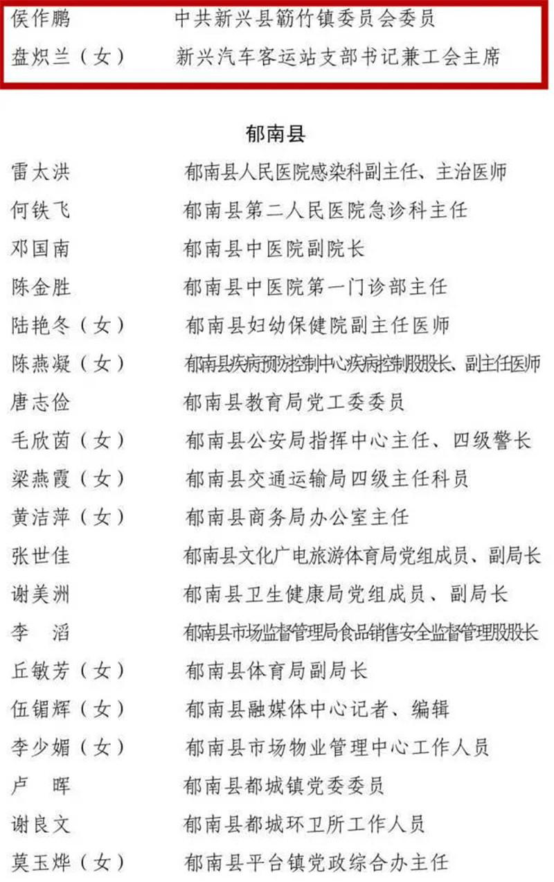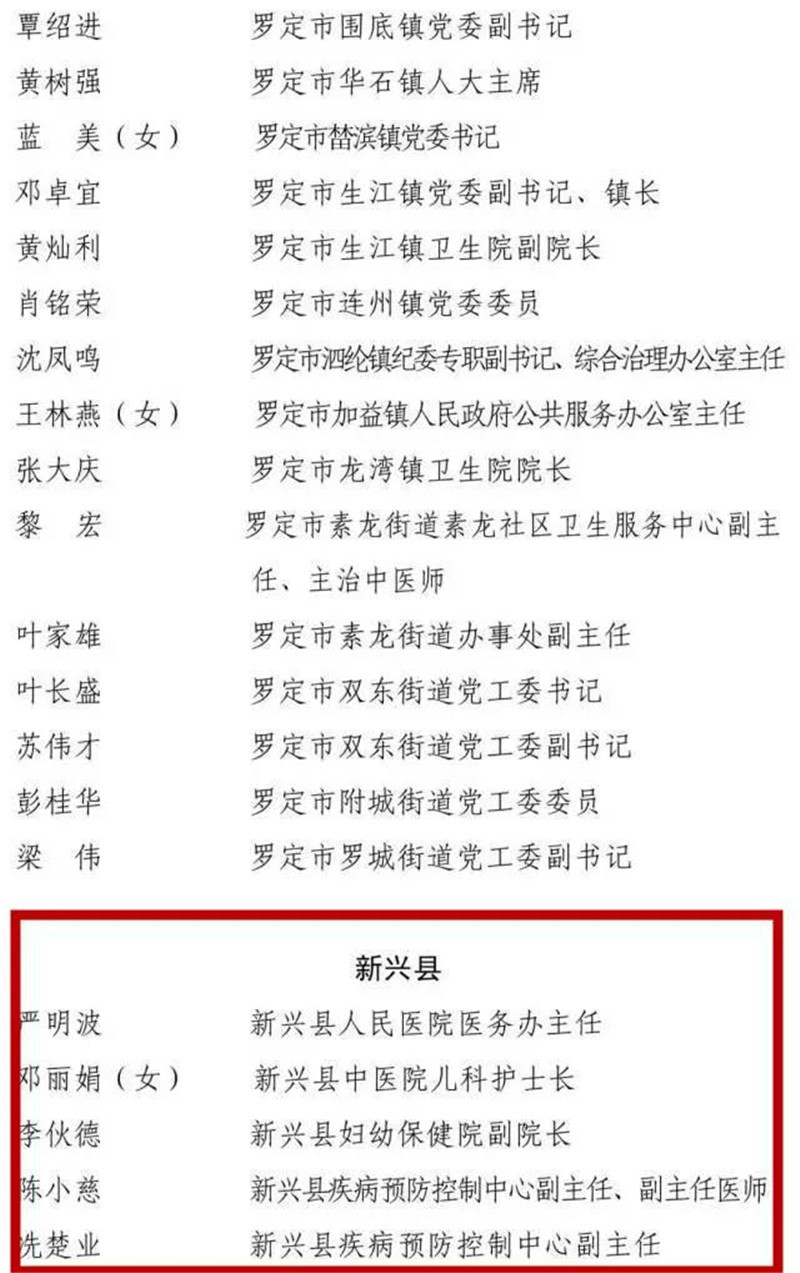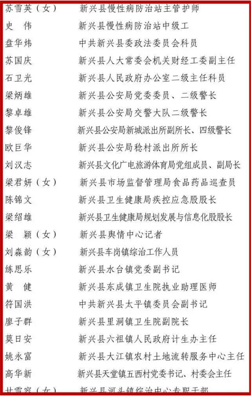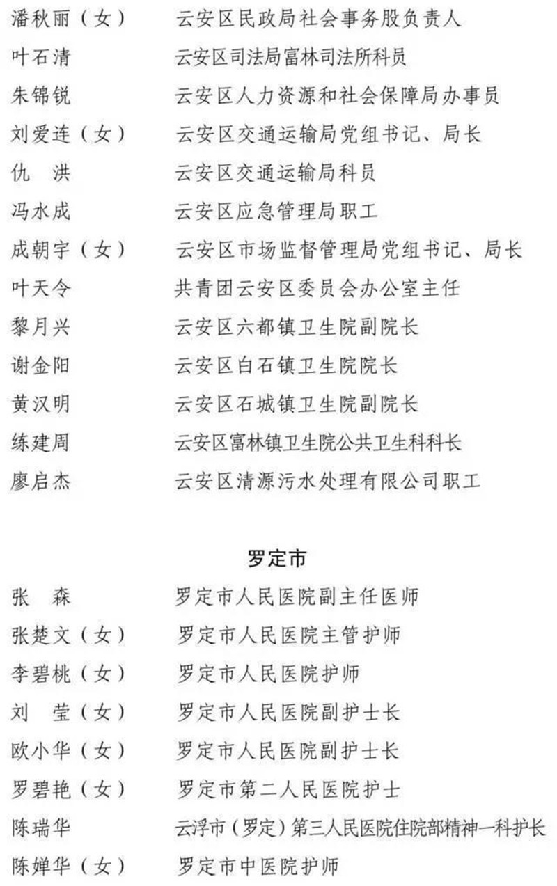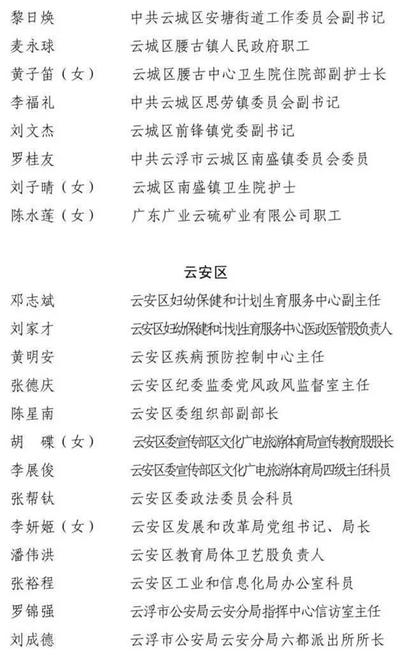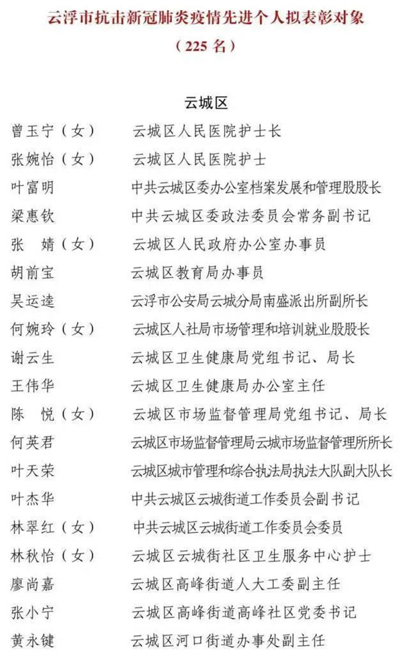 经省委、省政府批准,市委、市政府决定,以市委、市政府名义表彰一批在抗击新冠肺炎疫情斗争中涌现出的先进个人和先进集体,以市委名义表彰一批云浮市优秀共产党员和云浮市先进基层党组织。根据评选表彰工作部署,在各县(市、区)充分酝酿、集体研究的基础上,经综合评审、统筹考虑,确定曾玉宁(女)等225人为云浮市抗击新冠肺炎疫情先进个人拟表彰对象、云城区委政法委党支部等75个集体为云浮市抗击新冠肺炎疫情先进集体拟表彰对象;陈悦(女)等40人为云浮市优秀共产党员拟表彰对象、云城区云城街道党工委等25个集体为云浮市先进基层党组织拟表彰对象。