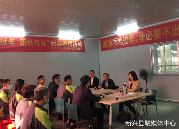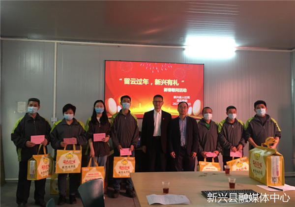 此外,县人社局和温氏股份相关负责人还来到企业进行慰问,为留在新兴过年的外来务工人员送上温氏熟食鸡、新兴景点门票等礼品,感谢他们配合疫情防控留在当地过年。