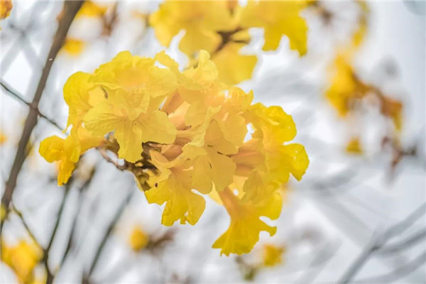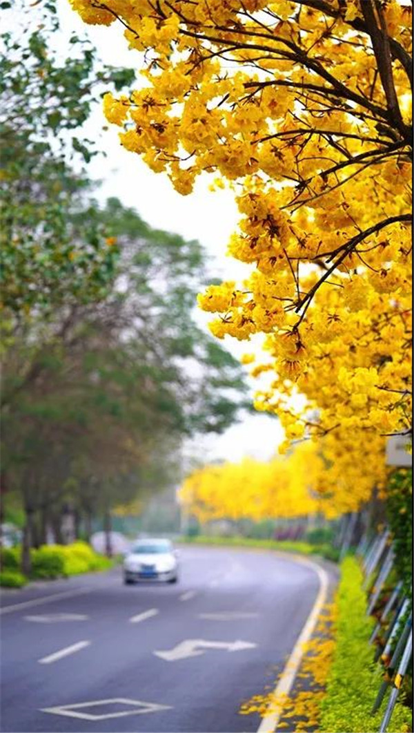 在六祖大道上一路前行,沿途黄花风铃竞相绽放,远远望去,一簇簇黄灿灿的花朵簇拥在枝头,如同一缕缕金黄花火,璀璨夺目,十分壮观。当路上的车辆经过时,金黄的花朵与路上的汽车构成一幅美丽的春日画卷。走近看,树上每朵花的花冠都呈漏斗形,状似风铃,花色纯黄,没有一点杂质,三五朵花聚成一簇簇花球,好似在光秃秃的树枝上挂了串串风铃,迎风摇摆,给春节增添一份喜庆。