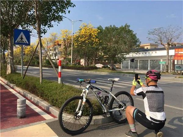 采访中,记者看到,在六祖大道绿道骑行的自行车运动爱好者苏先生也被这怒放的黄花风铃所吸引,停下来仔细欣赏并用手机记录下这美丽的景色。