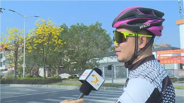 苏先生(自行车运动爱好者):"(黄花风铃)色彩特别艳丽,所以有时我都是特意兜多几圈(欣赏),觉得好靓,(看到)心情也好靓,希望新兴发展得越来越好,绿化或者绿道方面越来越靓,搞得越来越好。"
