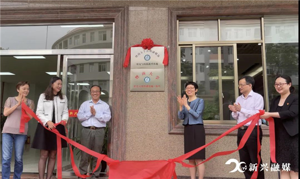 4月19日上午,暨南大学县级融媒体研究与实践新兴基地及暨南大学红色文化传播新兴基地揭牌仪式在新兴县融媒体中心举行。暨南大学传播与国家治理研究院名誉院长杨兴锋,市委常委、宣传部部长郭亦乐,暨南大学传播与国家治理研究院院长杨先顺,新闻与传播学院党委副书记、副教授张建敏,新闻与传播学院广告学系副教授李苗,县委常委、宣传部部长赵婷婷出席仪式并共同为基地衔牌揭幕。