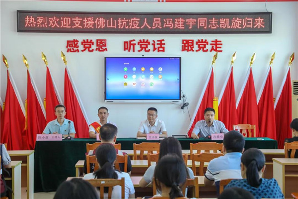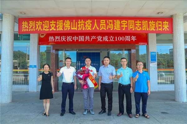 逆行出征,平安凯旋。7月12日上午,新兴县疾控中心喜迎抗疫战士——党员冯建宇支援佛山南海凯旋归来,卫生健康局局长江计昌出席凯旋仪式并为冯建宇带红领带,疾控中心主任冼楚业向他送花。
