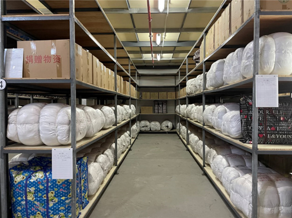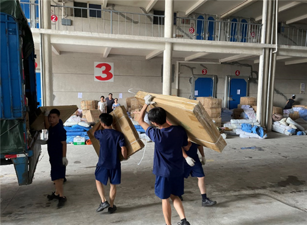 在防汛抗旱物资储备仓库看到,帐篷、折叠床、毛巾被、雨衣、蚊帐、移动桌椅等救灾物资正有序摆放,工作人员仔细清点物资并分批发放和装运。随即,一辆辆载满防汛物资的货车驶出仓库,开往全县各乡镇。
