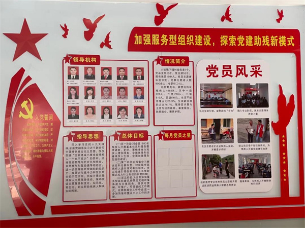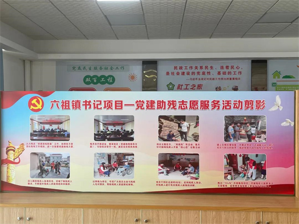 据介绍,六祖镇党委成立了六祖镇残疾人服务委员会,制定《党建引领扶残助残服务工作方案》,各村(社区)相继设立残疾人服务站,建立起“镇党委+村(社区)支部+驻村团队组长+驻村团队成员+各村(社区)健康党员”的五级组织机构,300多名镇村党员干部采取“一帮一”“一帮多”“多帮一”的形式,对辖区内的残疾人开展联村包片服务,明确目标任务,细化分工要求,形成强有力的领导责任体系。同时,建立联席会议制度,每月至少召开一次“书记项目”专题推进会,研究当月各村(社区)扶残助残工作的进展情况、推进难题等,主动对接市、县扶残助残帮扶单位,确保各项政策和特色服务活动有效推进。