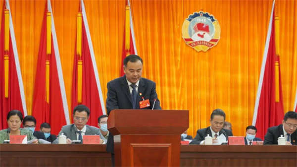 △十届县政协主席梁国华代表政协第十届新兴县委员会常务委员会向大会作工作报告。