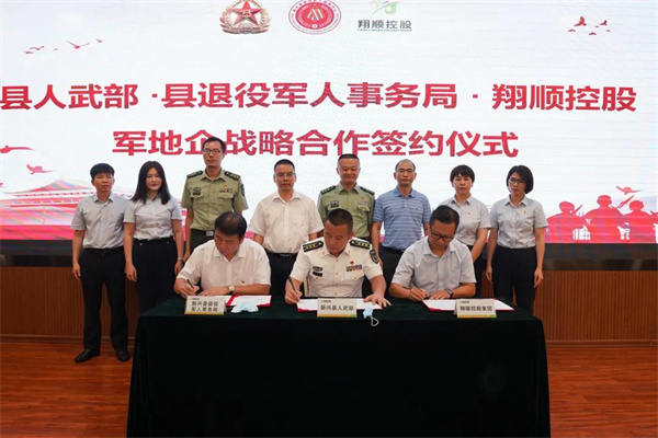 6月28日,云浮新兴县人武部、县退役军人事务局、翔顺控股集团有限公司在翔顺控股集团总部举行军地企战略合作签约暨退役军人服务站揭牌仪式。