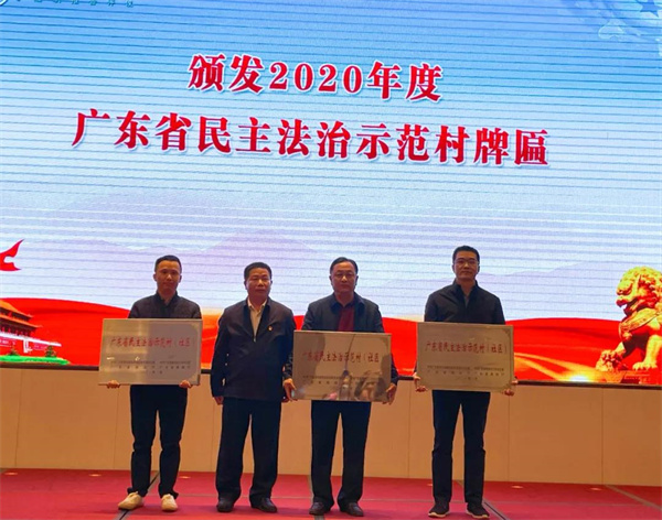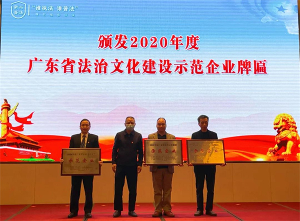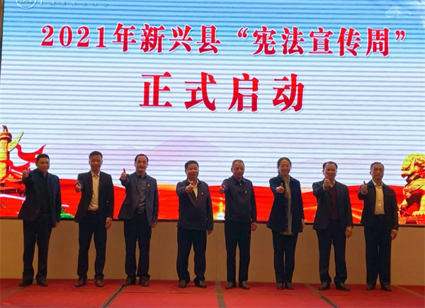 活动现场,伍树全、黄伟胜、王志洪等共同启动2021年新兴县“宪法宣传周”,并为2020年度广东省法治文化建设示范企业和2020年度省民主法治示范村(社区)颁发牌匾。