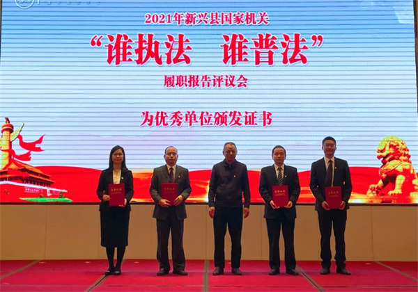 在随后举行的履职报告评议会上,县卫健局、县文广旅体局、县妇联和县烟草专卖局4个单位分别作“谁执法谁普法”责任制履职报告,并通过现场设置展板和实物展示普法工作成效。期间,由来自第三方的人大代表、党代表、政协委员、县直机关代表、基层代表、媒体代表、企业代表和律师代表等组成的评议团,综合各单位前期实地考察情况和现场展示内容,对各单位的履职报告情况逐一打分。