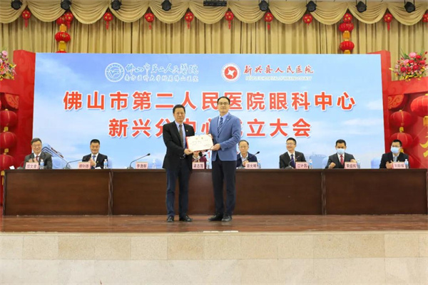 仪式上,与会领导共同为佛山市第二人民医院眼科中心新兴分中心揭牌;佛山市第二人民医院党委书记、院长李逸群为分中心主任颁发了聘书。