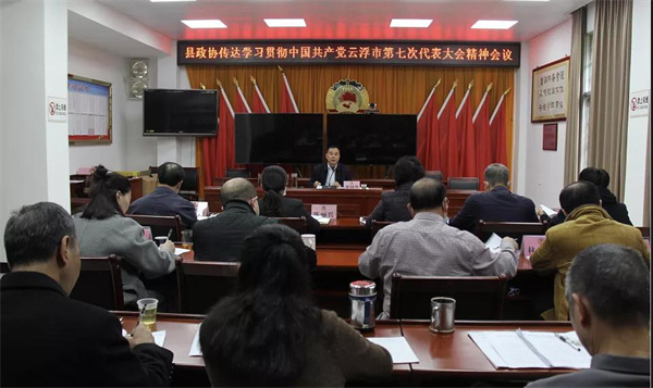 12月21日下午,县政协召开专题会议,传达学习贯彻中国共产党云浮市第七次代表大会精神,研究贯彻落实意见。县政协党组书记、主席梁国华主持会议。县政协班子成员、机关科级以上党员干部参加。