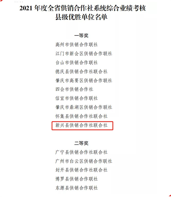 近日,广东省供销合作联社表彰2021年度全省供销合作社系统综合业绩考核名单公布,新兴县供销合作社联合社榜上有名,获评2021年度全省供销合作社系统综合业绩考核“县级优胜单位一等奖”。
