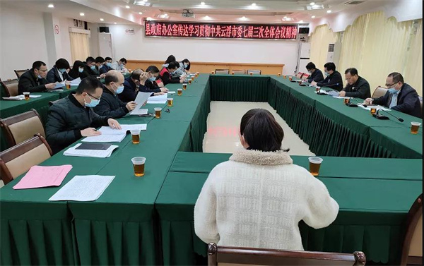 近日,县政府办召开专题会议传达学习贯彻市委七届三次全会精神。办公室党组书记、主任李彬主持会议并讲话,全体干部职工参加会议。