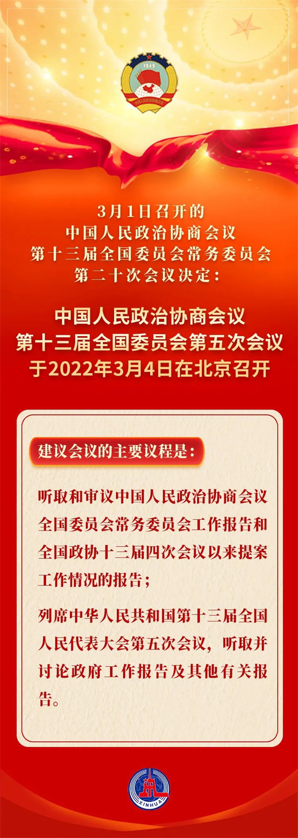 3月1日召开的中国人民政治协商会议第十三届全国委员会常务委员会第二十次会议决定:中国人民政治协商会议第十三届全国委员会第五次会议于2022年3月4日在北京召开。