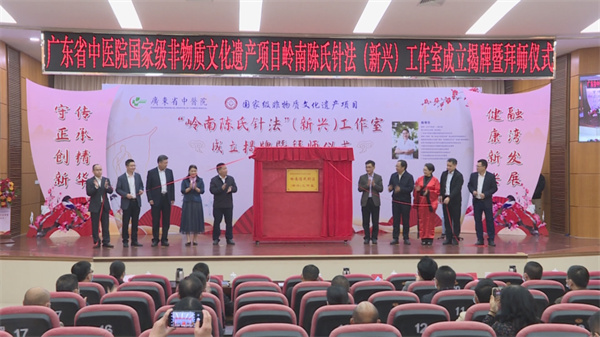 仪式上,柯忠、翟理祥、陈秀华、伍树全等共同为国家级非物质文化遗产项目岭南陈氏针法(新兴)工作室揭牌。