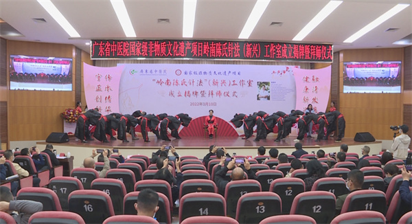 现场还举行了拜师仪式,20名徒弟面向国家级“非遗”项目“岭南陈氏针法”代表性传承人陈秀华行礼鞠躬、双手将“拜师帖”奉上,呈敬礼茶,接“回师帖”,送鲜花,表达了对师父的敬意,也表明了自己发奋努力、立志继承师父学术思想的决心。