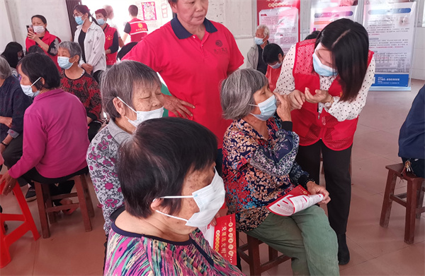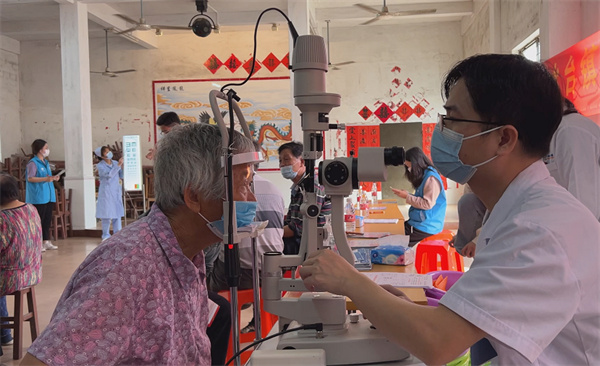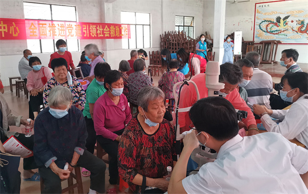 活动现场,来自六乡社区的50多名村民在党员志愿者、社工的组织下,有序开展了眼科疾病筛查。眼科医生用专业仪器对老年人眼部进行检查,向他们询问病史,了解眼疾情况,并根据检查结果给予专业性治疗建议。同时,向村民详细讲解眼睛日常保健常识,有效普及科学用眼护眼知识,提升眼病防治意识。