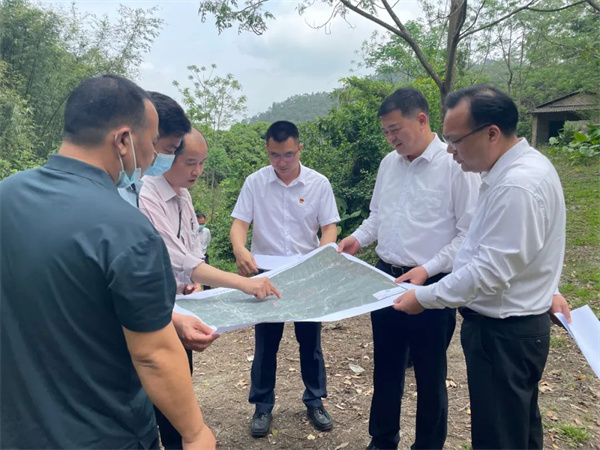 在新城镇雨洞石场和车岗镇盆古坑现场,陈哲江结合地形图和资源分布图,认真察看周边环境,听取相关汇报,详细了解周边地块矿产资源品类、分布、储量以及法规政策等情况。