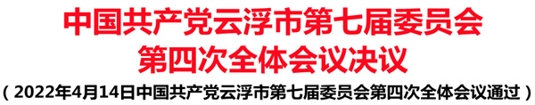 中国共产党云浮市第七届委员会第四次全体会议于2022年4月14日在云城召开。全会以习近平新时代中国特色社会主义思想为指导,深入学习贯彻党的十九大和十九届历次全会精神,紧扣省委、省政府“1+1+9”工作部署,纵深推进省委书记李希、省长王伟中调研云浮指示要求贯彻落实,动员引领全市上下牢记嘱托、感恩奋进、勇毅前行,凝心聚力打造粤北生态发展新高地、建设高质量发展的美丽云浮,切实用最坚定决心、最有力行动、最过硬成效回报总书记、党中央的厚爱重托,以优异的成绩迎接党的二十大胜利召开。卢荣春同志代表市委常委会主持会议并作工作部署讲话。