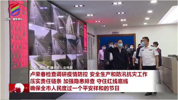 在市公安局指挥中心,卢荣春通过视频监控系统仔细察看了全市各重点路段道路交通、重要场所社会面管控和西江航道等实时情况,并连线各县(市、区),了解当地值班执勤和疫情防控、安保维稳等工作落实情况,要求各级各部门大力推进安保维稳、安全生产信息化监控系统建设,切实用现代科技织牢全市的“平安网”。