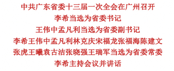 全会选出中国共产党广东省第十三届委员会常务委员会委员和书记、副书记,李希、王伟中、孟凡利、林克庆、宋福龙、张福海、陈建文、张虎、王曦、袁古洁、张晓强、王瑞军当选为省委常委,李希当选为省委书记,王伟中、孟凡利当选为省委副书记。