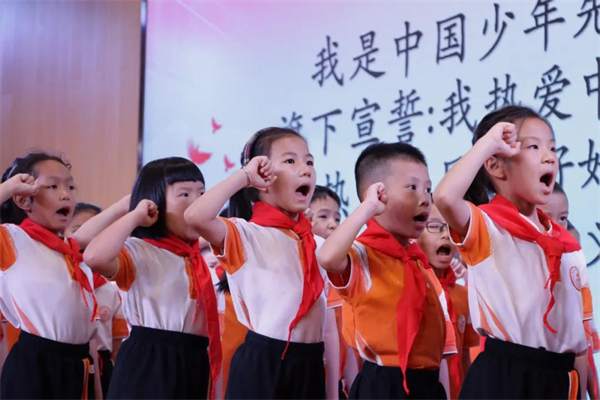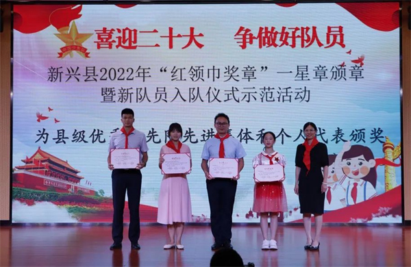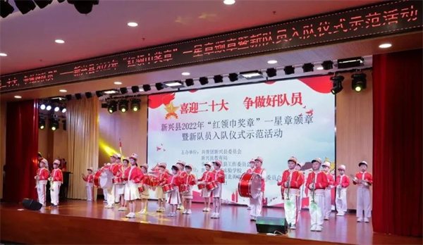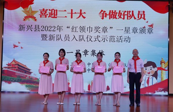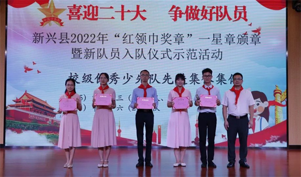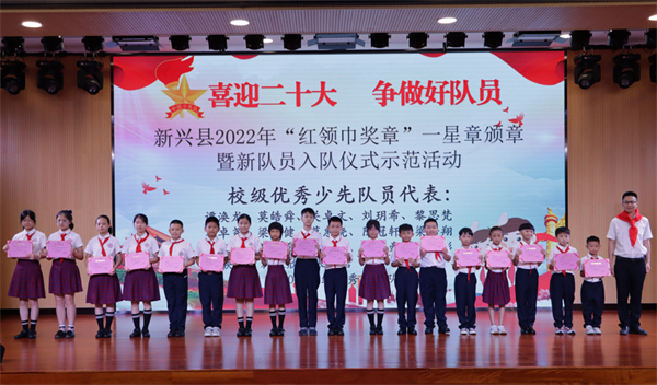 期间,伴随着激昂的出旗曲,新兴县北英实验学校少先队旗手和护旗手们踏着整齐的步伐,高举鲜艳的少先队旗,精神饱满地出队旗;伴随着《中国少年先锋队队歌》优美的旋律,老队员庄重地为新队员佩戴红领巾;新队员在大队长带领下,进行入队宣誓。仪式还为新建中队授中队旗以及宣布新聘中队辅导员名单。