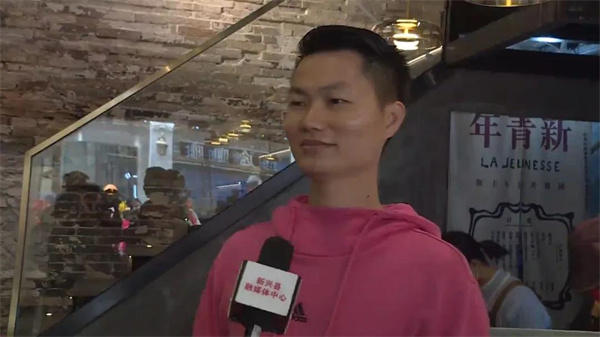 游客:“很激动,因为新兴难得有一条这么美的街,(你觉得它美在哪里?)喜欢她的风格和这些旗,晚上的灯光和灯笼,尤其是它的建筑风格,新兴有一条这么美的街,游客肯定会来走一走。”