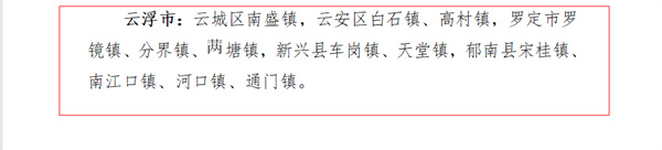 云浮市12个城镇上榜:云城区南盛镇,云安区白石镇、高村镇,罗定市罗镜镇、分界镇、?塘镇,新兴县车岗镇、天堂镇,郁南县宋桂镇、南江口镇、河口镇、通门镇。