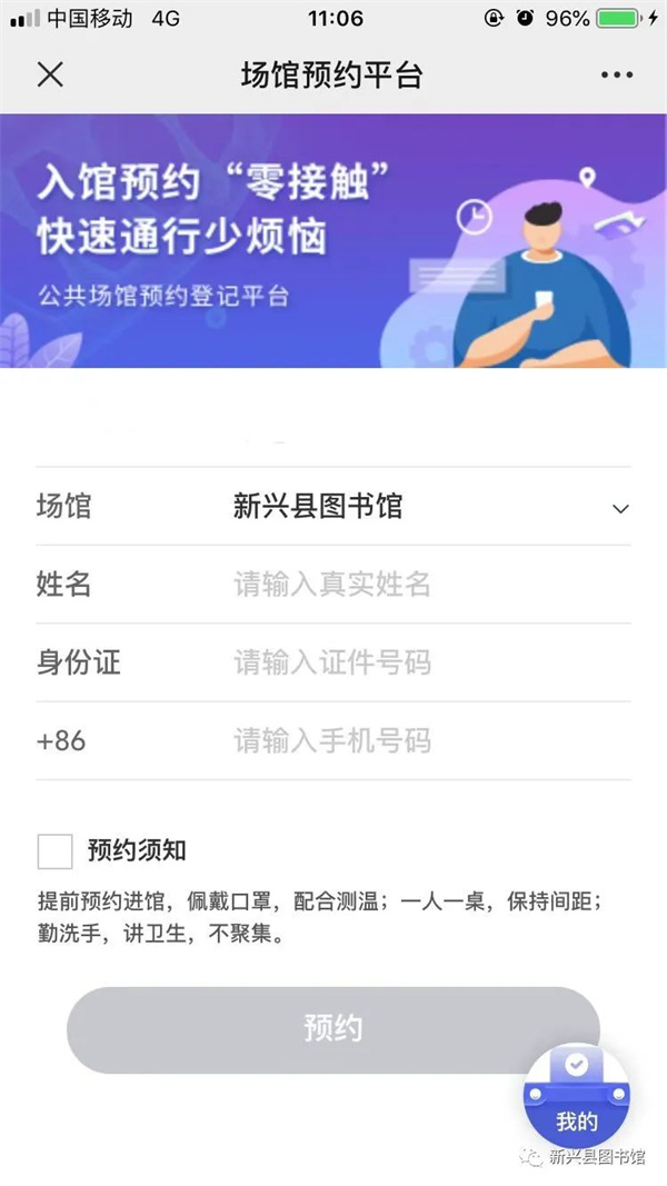 2、关注“新兴县图书馆”微信公众号,进入联系我们【预约登记】,填写个人信息进行预约。