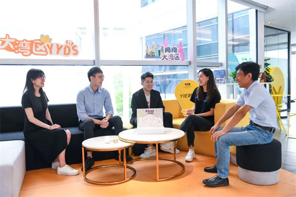 在位于深圳市的前海深港青年梦工厂,香港创业青年们一起交流各自的创业项目(2022年6月20日摄)。新华社记者 梁旭 摄