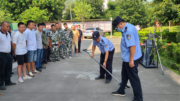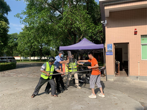 在镇政府大院内,何杰桐警官和同事演示了钢叉、盾牌、警棍等装备的使用方法。参训人员在现场观摩“不法分子或恐怖分子”持械进入单位大院无差别伤害在场工作人员和群众”的演练。