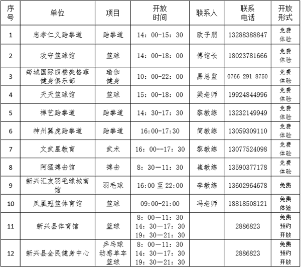 据了解,本次免费向市民开放的12个健身运动场馆包括忠孝仁义跆拳道、攻守篮球馆、筠城国际四楼美格菲健身俱乐部、天天篮球馆、禅艺跆拳道、神州翼虎跆拳道、文武星教育、阿猛搏击馆、新兴汇友羽毛球城南馆、凤凰冠篮体育馆、新兴县体育馆、新兴县全民健身中心。市民可以尽情投身到全民健身活动中,享受运动健身带来的乐趣。