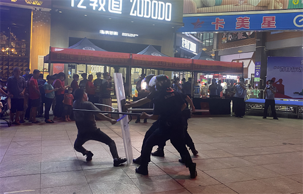 活动中,巡警大队队员进行了最小应急单元应急处置演练,向现场群众展示了在突发事件情况下所采取的防御措施及打击控制的基本能力,赢得群众阵阵热烈的掌声。