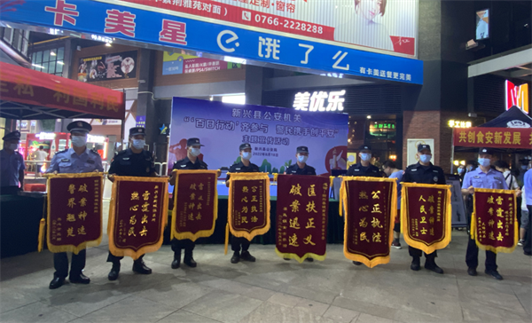 今天,我们在这里举办“‘百日行动’齐参与 警民携手创平安”主题宣传活动,主要是向群众展示新兴公安在行动开展以来取得的各项成绩战果,同时通过现场宣传,提高广大群众的安全防范意识与法治意识,营造全民参与“百日行动”的浓厚社会氛围。“警力有限 民力无穷”,在此,我们呼吁广大市民朋友下载安装“国家反诈中心APP”,保护好自己的钱袋子,尽快申领“粤居码”,享受更便捷的生活。通过“平安厅”信箱等渠道,积极举报各类违法犯罪线索,积极参与社会治安群防群治,共同守护平安新兴。