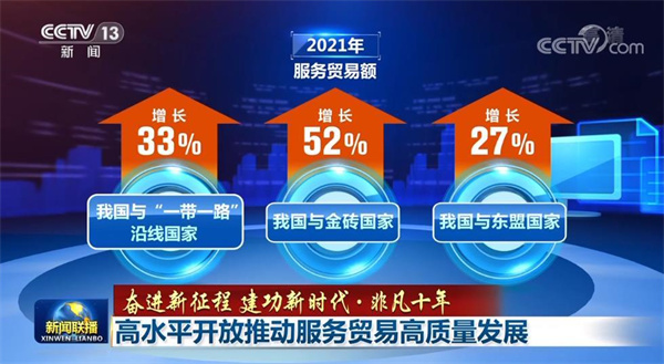 十年间,我国服务贸易“朋友圈”不断扩大。目前,与我国有服务贸易往来的国家和地区增加到200多个。2021年我国与“一带一路”沿线国家服务贸易额增长33%,与金砖国家增长52%,与东盟国家增长27%。