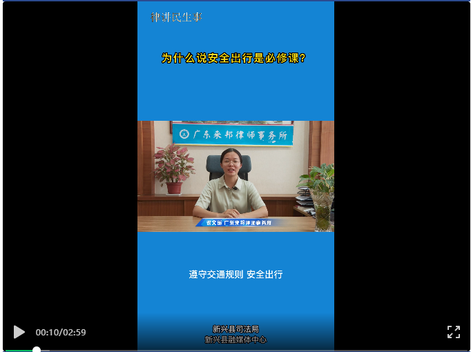 为丰富和创新交通安全宣传形式,提高新兴县居民特别是青少年的安全文明出行意识和遵法守规自觉性,预防和减少道路交通安全事故,为党的二十大胜利召开营造安全畅通的道路交通环境,新兴县司法局组织律师拍摄律师民生事线上宣传片,对《中华人民共和国道路交通安全法》进行线上专题宣讲。