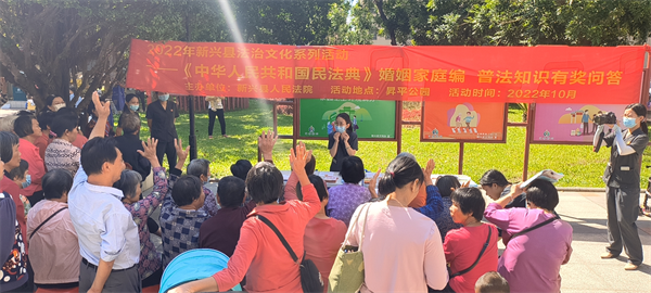 为提高群众对涉婚姻家庭法律知识的认识,保障自身合法权益,构建和谐婚姻家庭关系,10月14日,新兴法院组织党员干警在县昇平公园开展民法典婚姻家庭编法治文化活动。