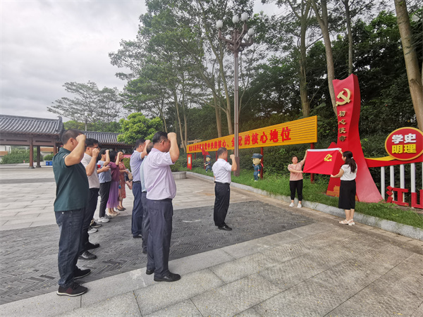 (三)红色教育强党性。为庆祝中国共产党成立101周年,7月1日,县民政局党支部开展“我是党员跟我上”主题党日活动,局党组书记、局长欧金荣带领全局党员到太平镇党建公园、凤凰湿地公园进行参观学习,实地了解党建赋能乡村振兴的具体成效和经验特色,提高党员干部党性修养,加深为人民服务的信念。期间,全局党员分别游览院内新时代红色文化建筑,聆听解说员对本镇红色革命历史的发展历程讲解,并深入凤凰来仪阁了解太平镇镇域经济发展现状。一行人还重温入党誓词,回顾入党宣誓时的庄严承诺和奋斗追求,庄严宣誓不忘初心、牢记使命。