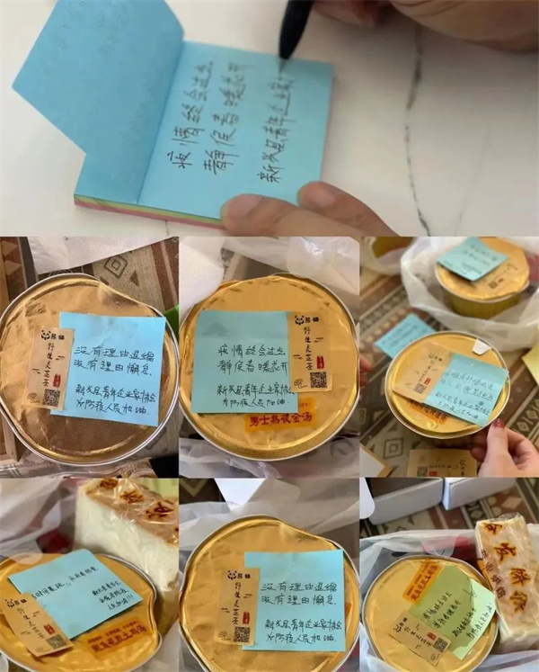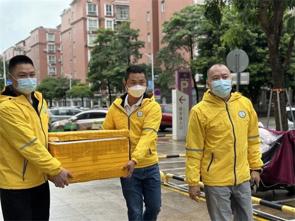 11月4日上午, 新兴青年企业家协会一行人前往凤凰广场、温氏科技园、凌丰紫荆花园防疫一线,慰问风雨中坚守在核酸检测点的防疫工作人员们,并为他们送上热汤、糕点等慰问品。