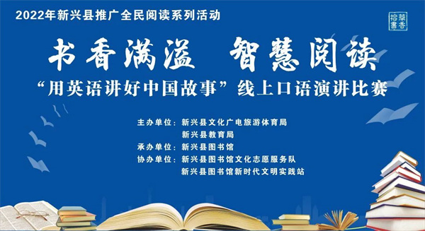 为庆祝党的二十大胜利召开,讲好中国故事,坚定文化自信,发挥图书馆在国际文化交流方面的推动作用,为全县读者搭建起用外语传播中华文化的舞台,新兴县文化广电旅游体育局、新兴县教育局将举办书香满溢 智慧阅读 “用英语讲好中国故事”线上口语演讲比赛。