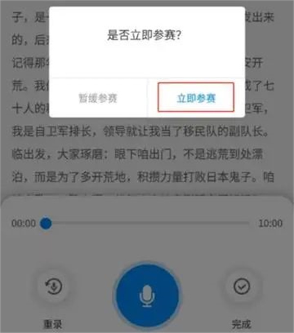 3.点击“完成”按钮,选择“立即参赛”并提交参赛信息,或者选择“暂缓参赛”进入到我的朗诵列表,回听对作品满意后再进行提交。作品审核通过后将正式进入参赛列表。