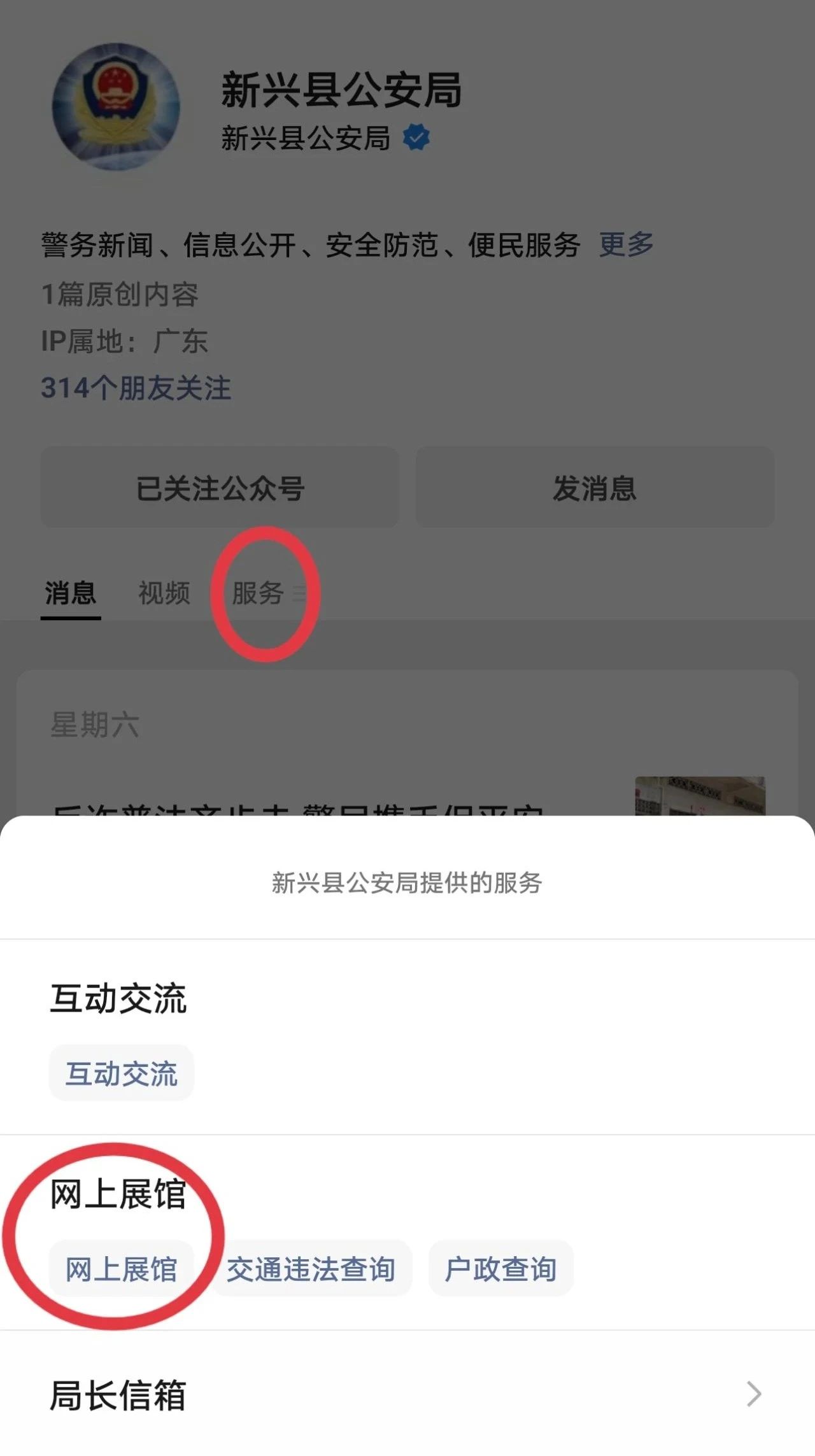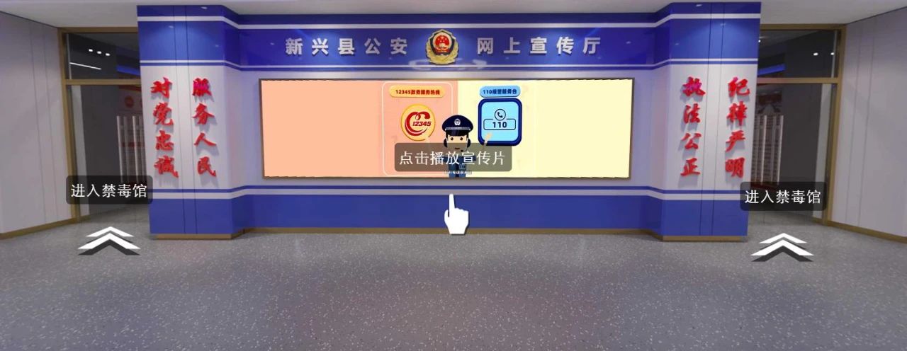 关注“新兴县公安局”微信公众号,点击“服务”——“网上展馆”——“网上展馆”即可进入参观。