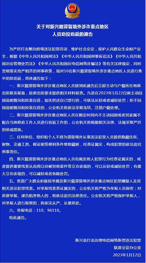 【文明创建】新兴这10人滞留境外涉诈重点地区,请主动回国投案自首!