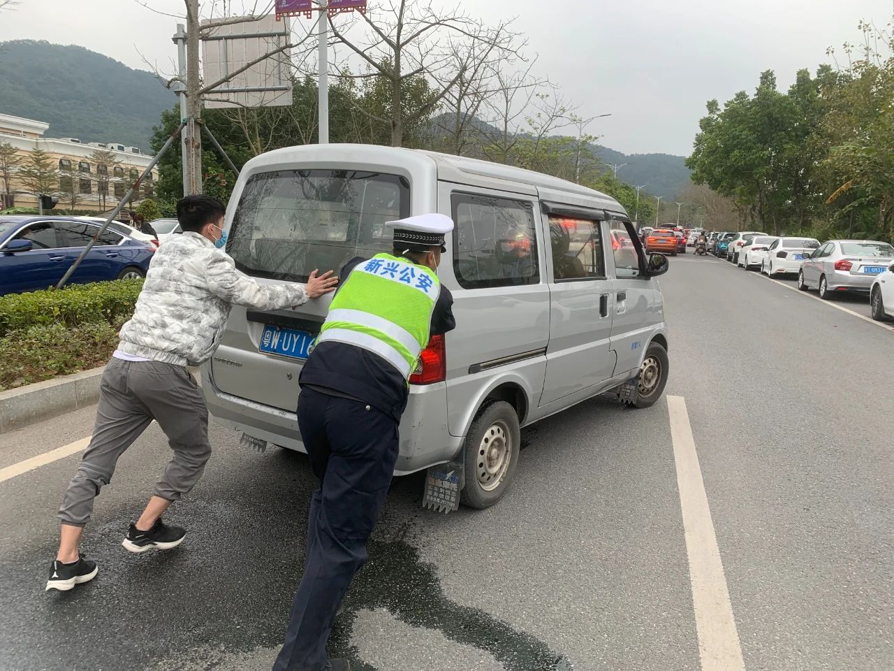 大年初五下午,一辆面包车因故障停在行车道上,交警化身“大力士”帮助群众将故障车辆推行至路边安全区域,及时消除安全隐患,保障该路口安全畅通有序,同时提醒驾驶人每日做好出车前安全检查工作再上路。